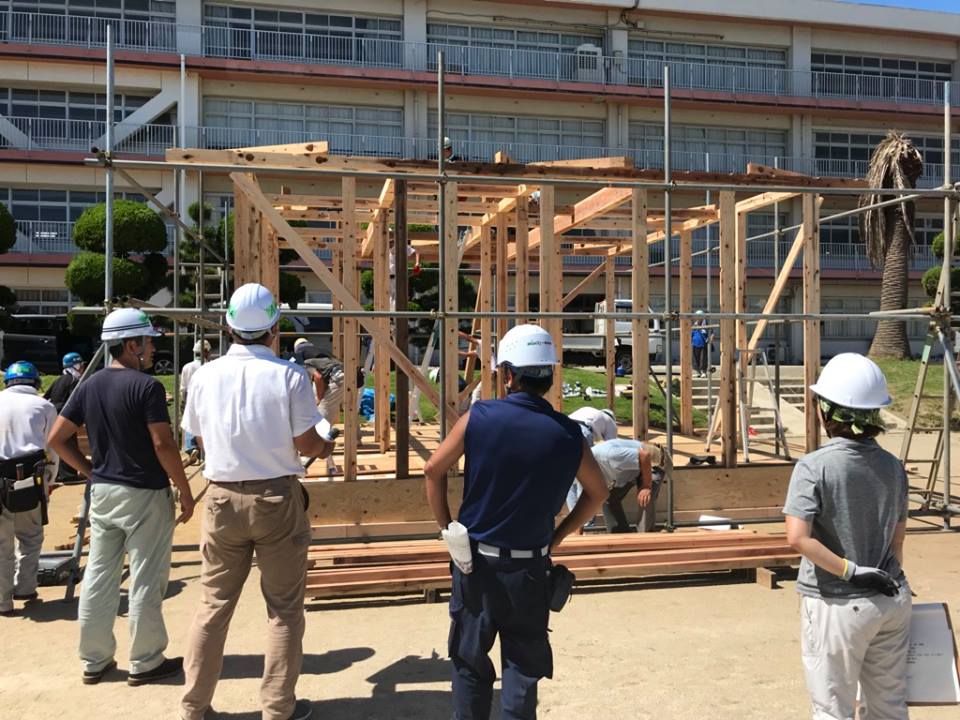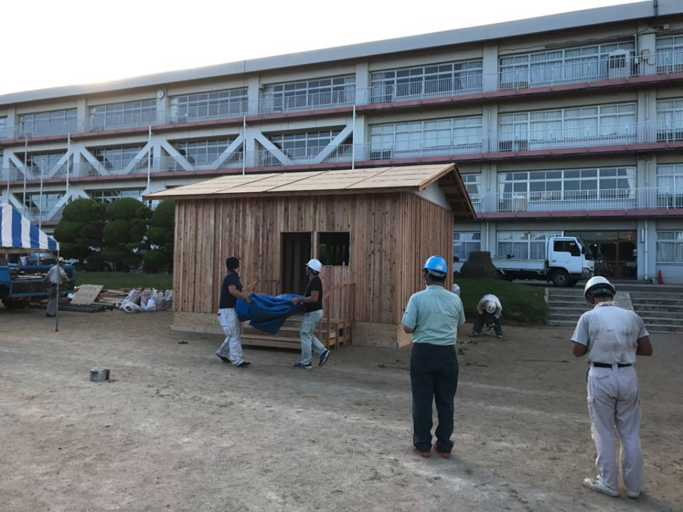 先週の水曜日に、勝浦市勝浦中学校校庭に、木造仮設住宅を建設しました。
